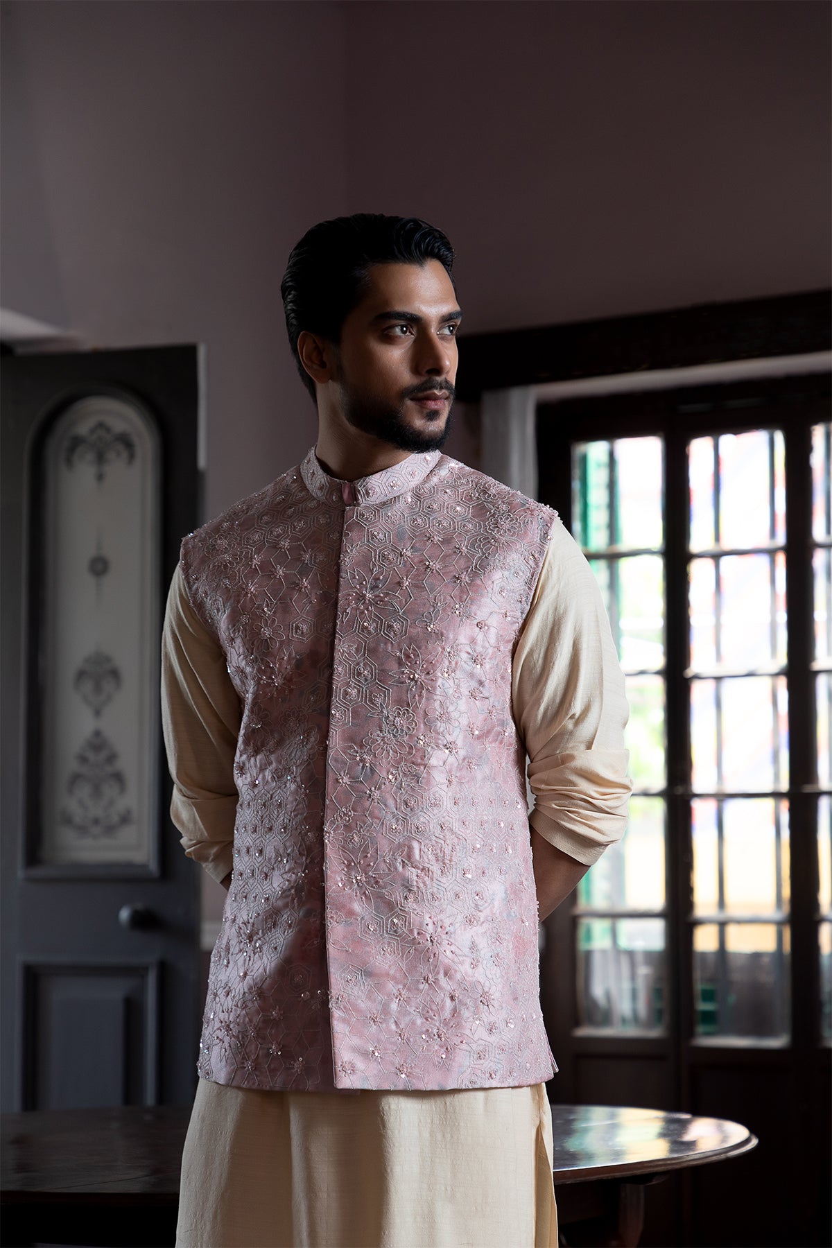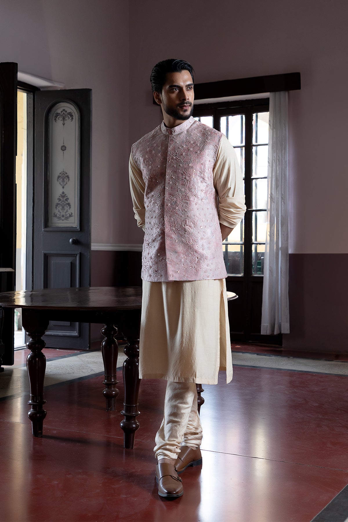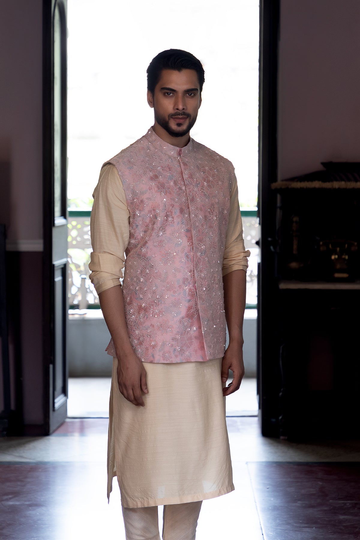 This statement piece blends traditional silhouettes with unexpected fabrics. The outer layer features a captivating interplay of textures: organza’s weightless drape adds a touch of breezy elegance, while mudal satin’s smooth luster creates a sophisticated base. Look closer, and you’ll discover a hidden layer of breathable mul cotton for everyday comfort, ensuring you stay cool during any occasion. Hints of munga georgette’s unique texture peek through, adding a touch of modern flair and a subtle sheen. This versatile jacket is perfect for the discerning the man who appreciates both tradition and a touch of unconventional style.