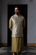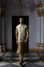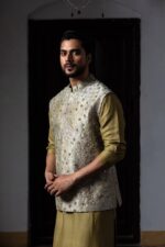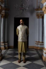 This contemporary creation redefines traditional menswear with its innovative blend of fabrics. The outer shell features a captivating textural symphony: organza’s airy elegance dances alongside mudal satin’s rich sheen, creating a truly eye-catching statement. A hidden layer of breathable mul cotton ensures all-day comfort, while subtle hints of munga georgette’s unique texture peek through, adding a touch of modern mystique. This jacket is the perfect fusion of heritage and innovation, ideal for the confident Indian man who wants to turn heads and redefine traditional style.